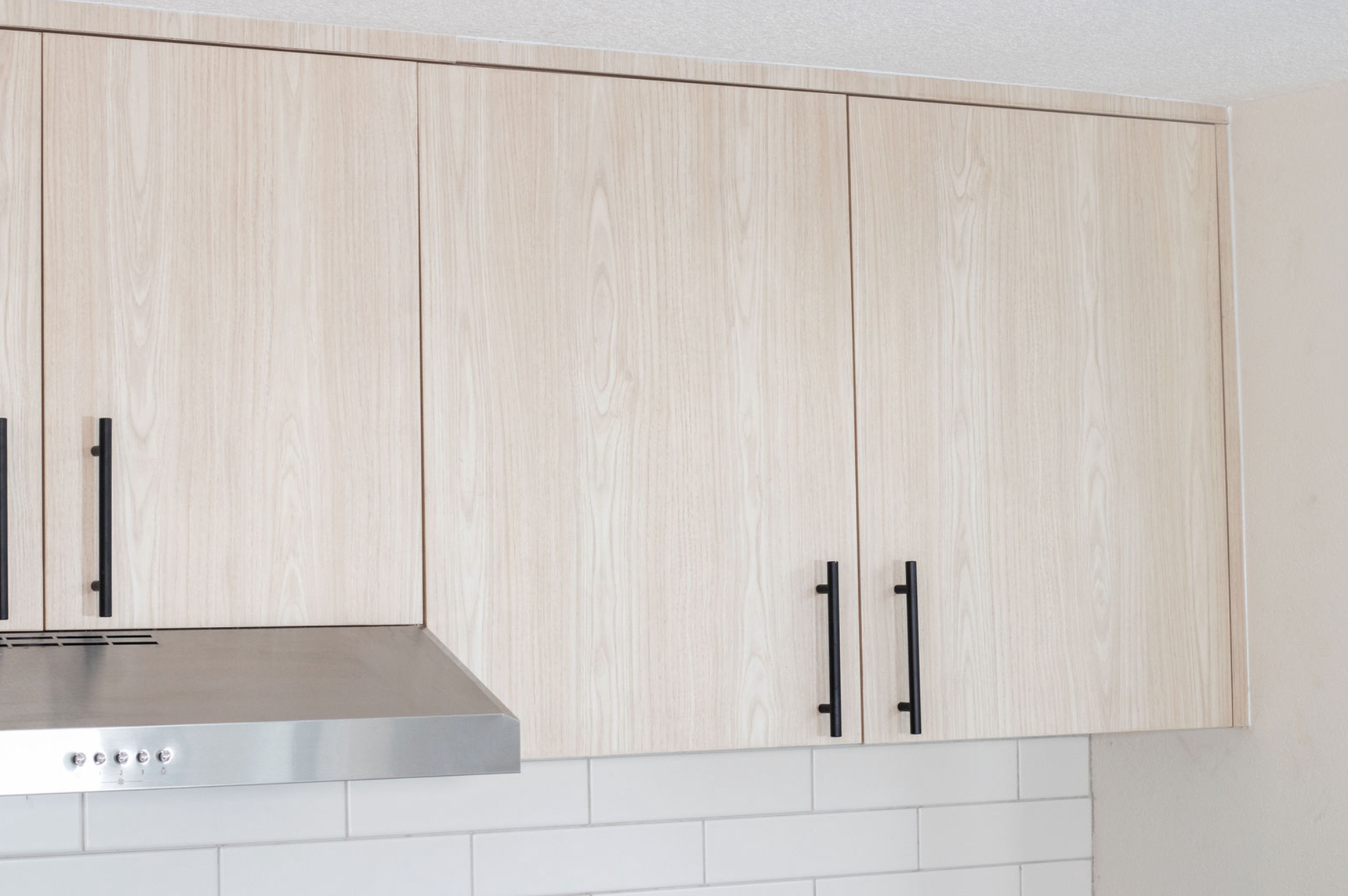 Los módulos superiores e inferiores mantienen una línea uniforme que da sensación de limpieza, mientras que los detalles en negro —campana, jaladeras y cubierta— equilibran el diseño con un toque contemporáneo.