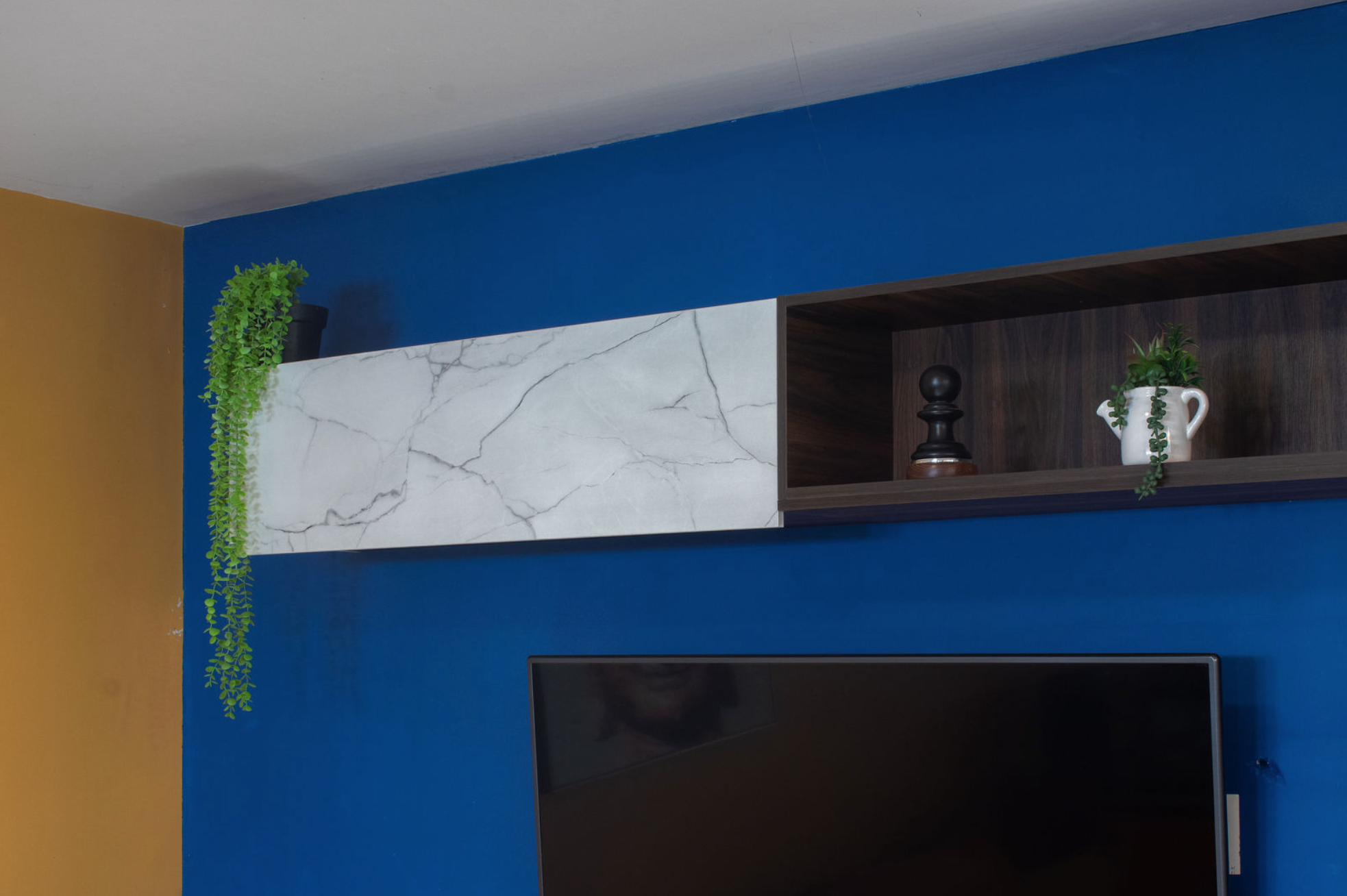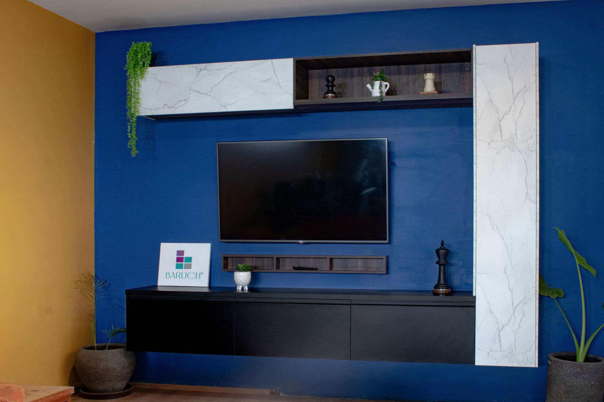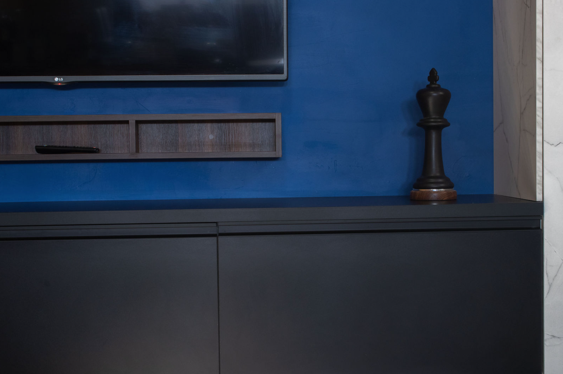 El centro de TV diseñado para Oscar transforma la sala en un punto focal elegante y funcional. La mezcla de acabados negro mate, texturas oscuras y paneles tipo mármol crea un contraste moderno sobre un muro azul profundo que aporta fuerza y personalidad al espacio.
